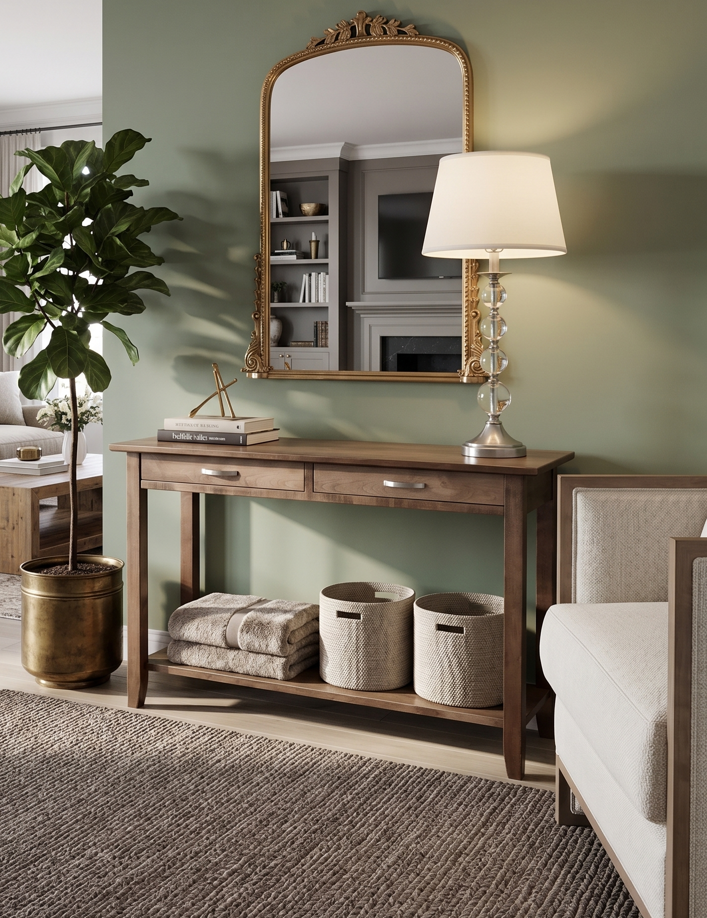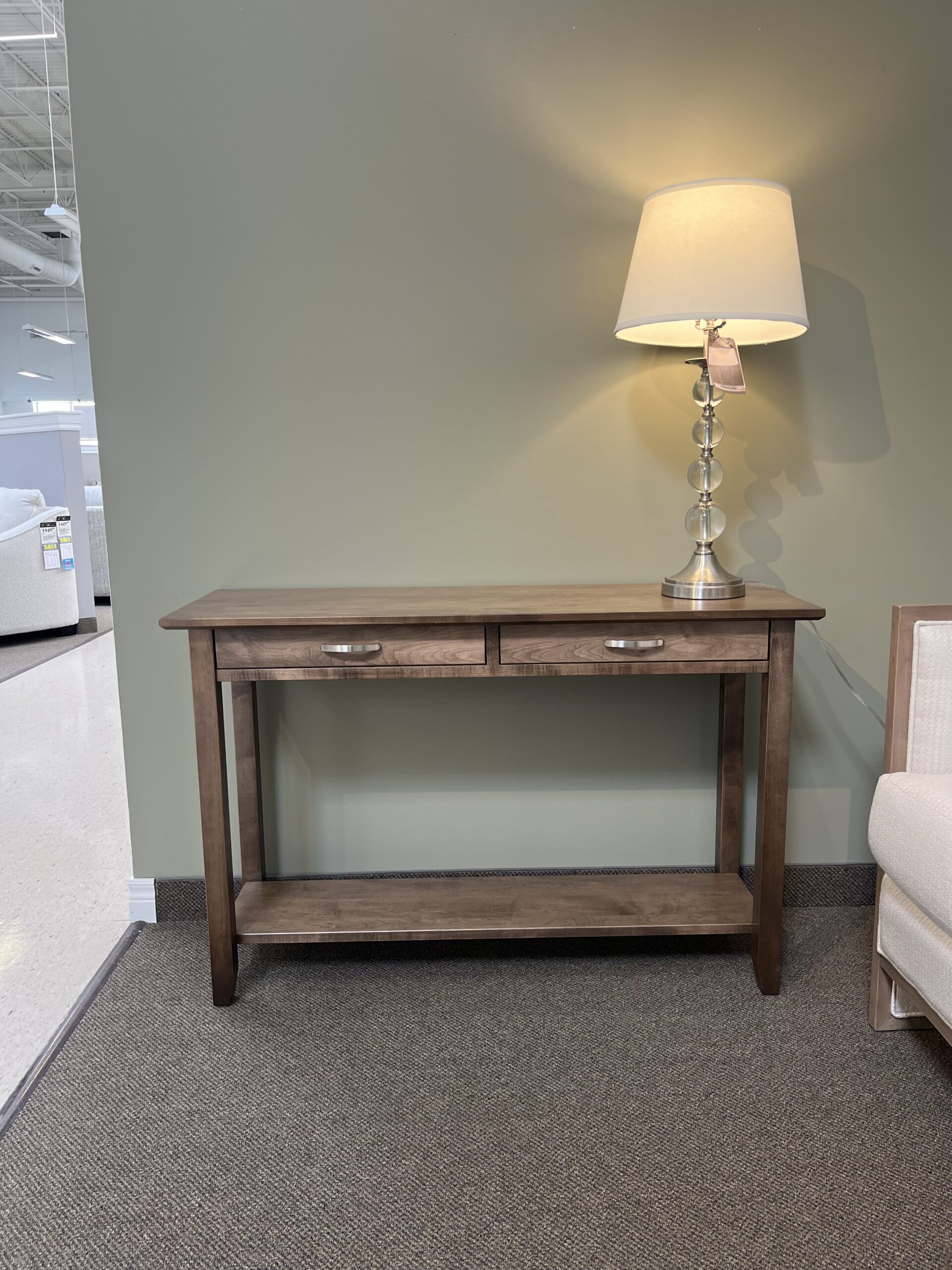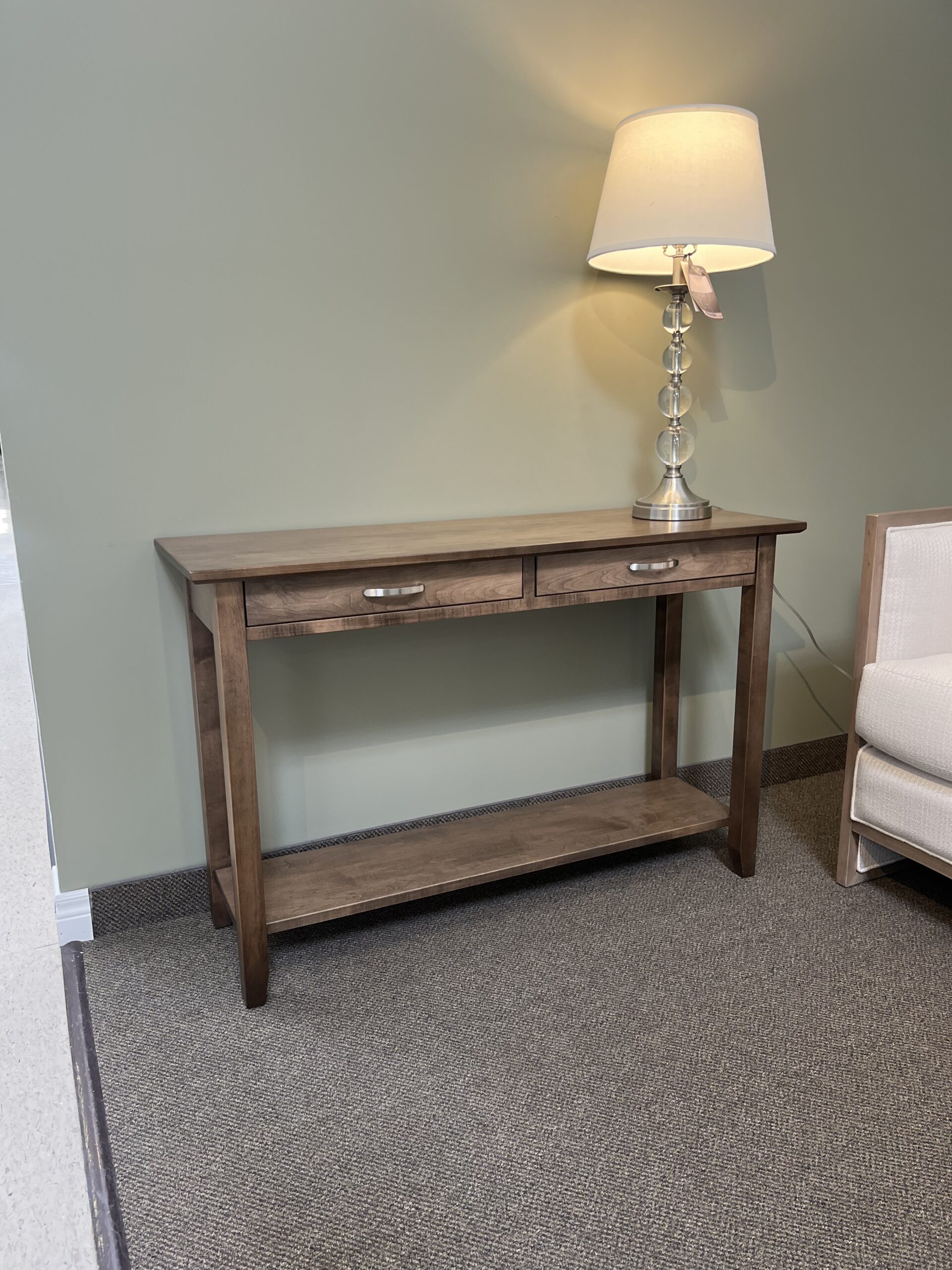 Item: 46″ Demilune Sofa Table With 2 Drawers & Shelf